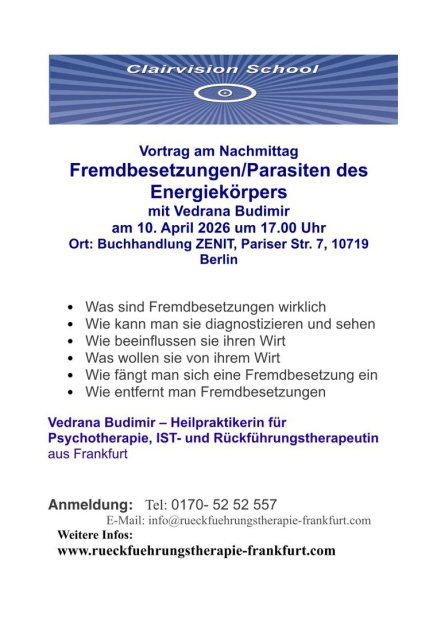 Fr. 10.04. NEU Der Vortrag am Nachmittag: Fremdbesetzungen / Parasiten des Energiekörpers. Vortrag mit Vedrana Budimir (17 -18 Uhr / Spende)